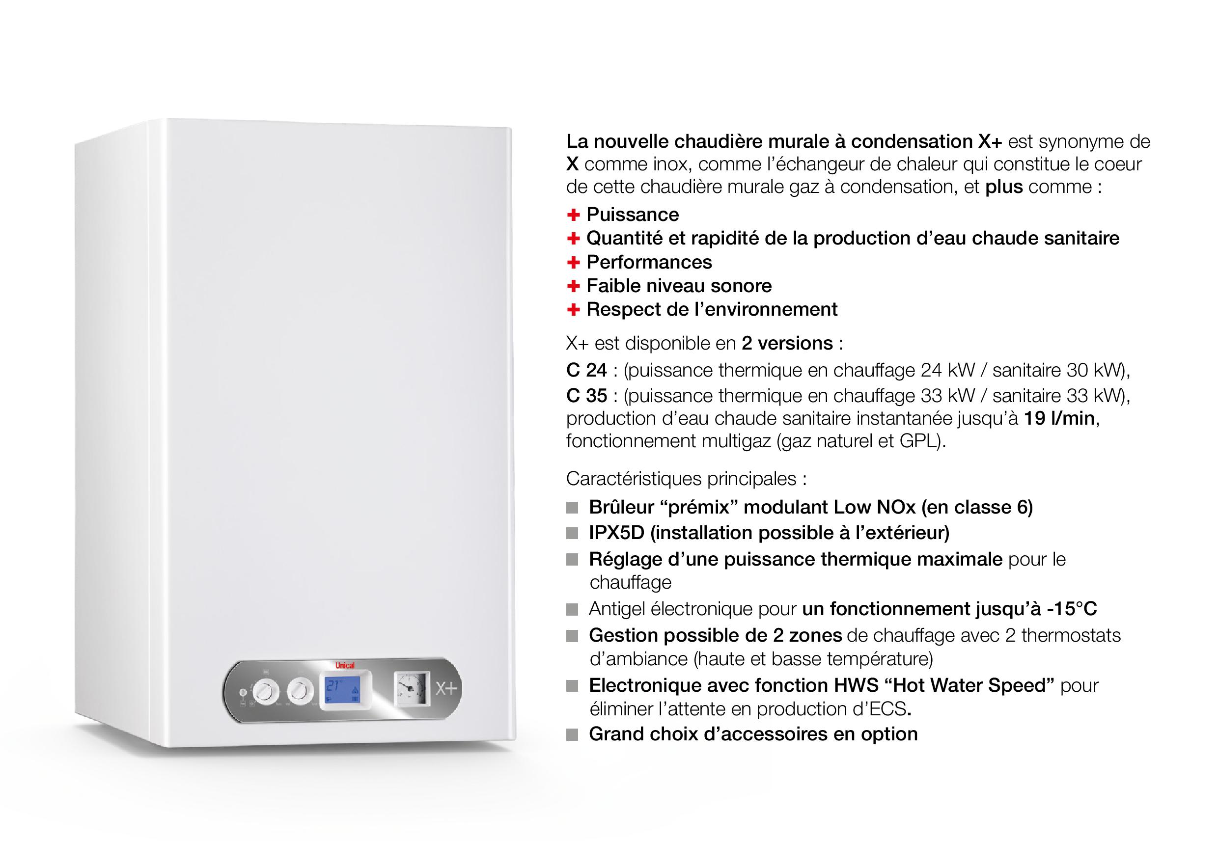 Chaudière murale gaz avec brûleur à pré-mélange total, à condensation “Low NOx” en classe 6 – à chambre de combustion étanche – allumage électronique et modulation de la puissance fournie – IPX5D – installation possible à l’extérieur.